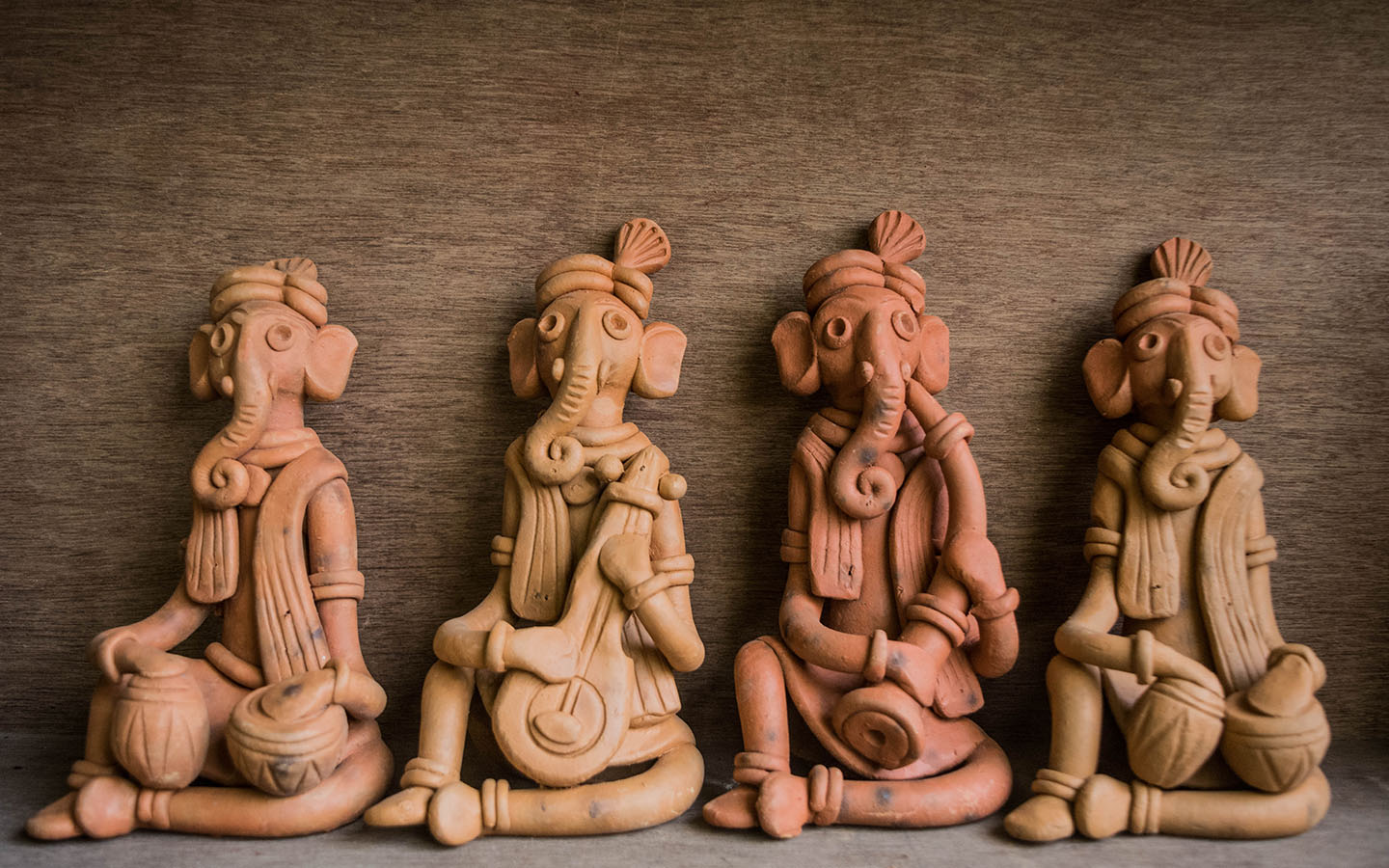 Panchmura, situated in Bankura, is celebrated for its dynamic terracotta artistry. Known for its distinctive 'Bankura Horse,' this vibrant hub showcases a diverse range of terracotta products, including intricate animal and human figurines, as well as utility items, home décor, and jewellery. This ancient craft, perfected through sun-baking and kiln-firing with eucalyptus leaves, produces stunning pieces in earthy tones of ochre and red. Recognised with a Geographical Indication (GI) certification in 2018, Panchmura boasts more than three hundred skilled terracotta artists.